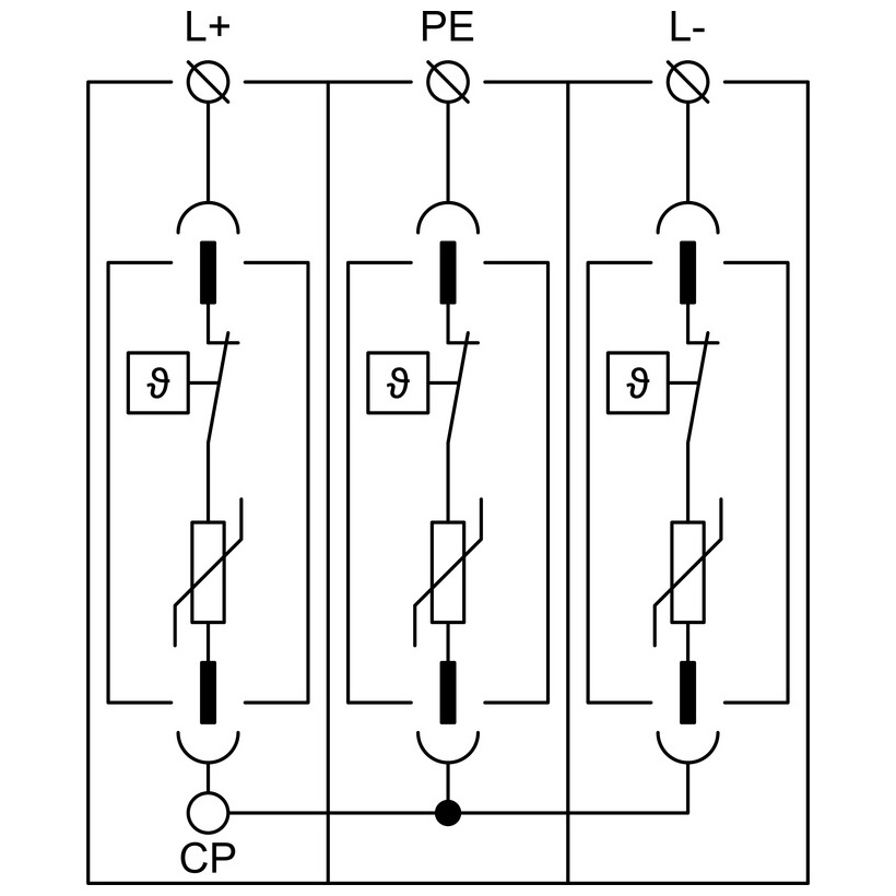 تم تجهيز كل قطاع متغير بين L+و L - و PE بفصل حراري داخلي. في نهاية العمر المتنوعة (ارتفاع درجة الحرارة) ، رحلات قطع الاتصال لمقاطعة التيار العاصمة وتوفير مؤشر خطأ واضح. يتيح بناء فصل خاص التثبيت دون فتيل احتياطي منفصل ، وتبسيط التنسيق ومساحة التوفير.